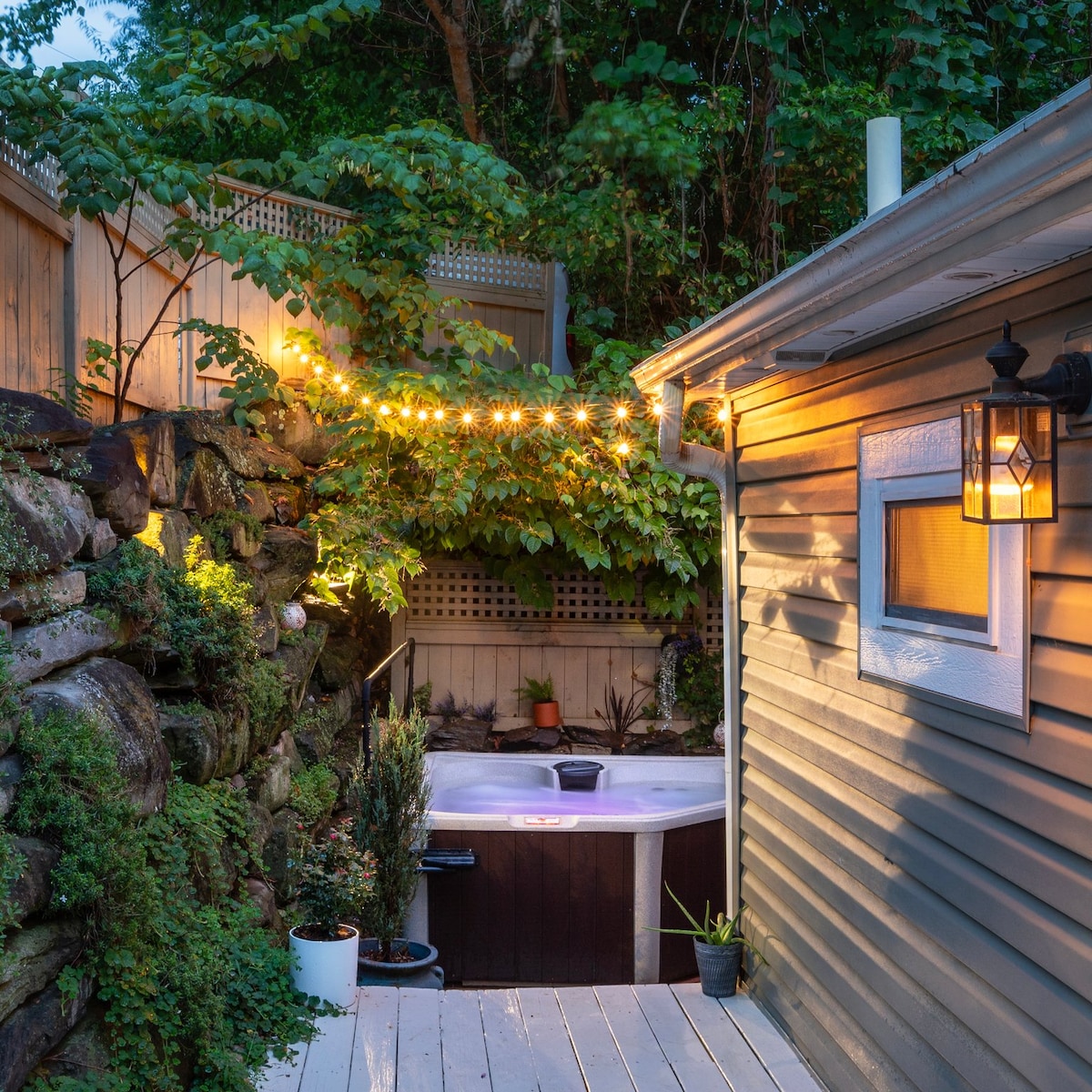 Architect-designed Loft and Cozy-Styled 1 bd 2 bth apt. (625 sqft) Overlooking Trees and DT AVL. PVT HOT TUB, Full Kitchen, Large Porch in RockWall Garden Nook/Lounge Entrance, Bdrm Deck. Nestled amongst large trees in the Heart of Beautiful Asheville. WALK to the HEART of DOWNTOWN in 7 Min. FREE PVT PARKING! Iconic Pack Square, South Slope, French Broad Chocolate Lounge among all breweries, restaurants n coffee houses 7 min Walk. Cozy. Relaxing. Romantic. Modern Open apt. attached to the home