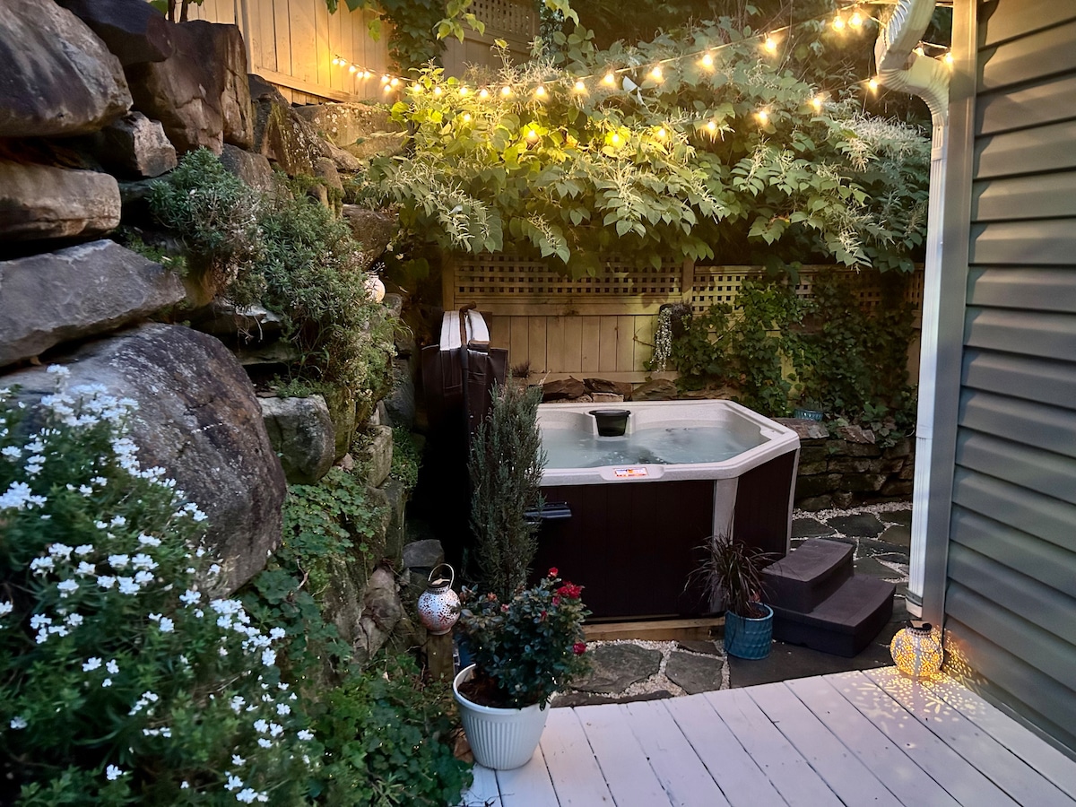 Come unwind and breathe at our couples mountain spa retreat. Atrium House has been designed to feel open to the lovely mountain surroundings yet let you relax in privacy. Our outdoor therapy hot tub, indoor/outdoor gas fireplace, and spacious two-person, walk-in shower make for a getaway so tranquil, you may never make it in to nearby Asheville! We're out in the country but just over a 15-minute drive from downtown Asheville, Biltmore, Hendersonville, Asheville Airport, and dozens of breweries.