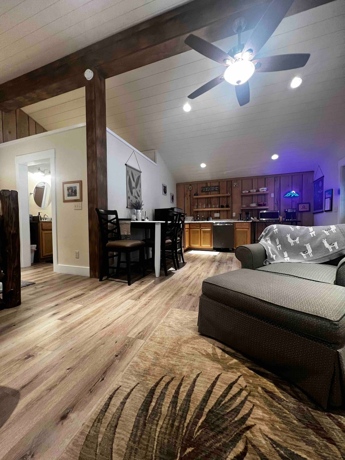 Climb a set of exterior stairs thru your private entrance and enter a bright, airy, modern space with some mid-century charm. You'll be welcomed into the space by beautiful floors made from reclaimed barn wood. An open floor plan includes the living room with 55" smart TV, kitchen and dining areas. The kitchen is fully equipped. The bedroom has a super comfy queen bed, dresser and large walk-in closet. We are 100% solar powered and offer a Level 2 EV charger for guests.