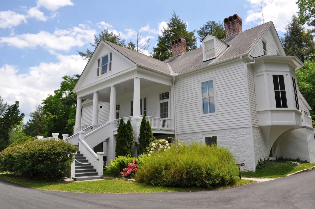 The Grand Porch Guestroom (Room #1) is our only step free access room and has a King bed and en-suite bath. Common areas include a 1st & 2nd floor living room (where the complimentary light breakfast is available), dining room, game room, fire pit and a 50' porch overlooking downtown and the French Broad River. A short walk from charming, walkable Main St with its riverside cafes, restaurants, shops & brewery, and 25-minutes from Asheville, the Inn is on the National Register of Historic Places.