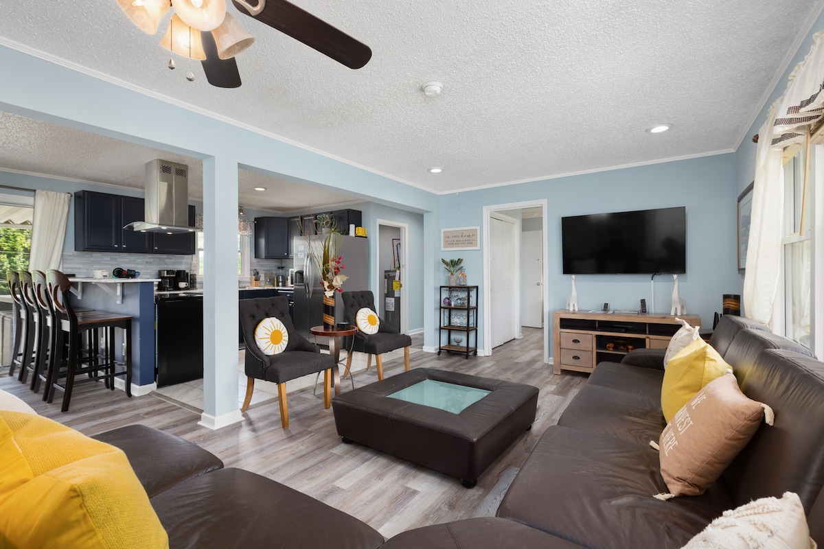 Bring the crew to a calm 4BR (up to 9) base near Asheville. Two living rooms spread out the day—movies in one, quiet chats in the other by the gas fireplace. Cook in the stocked kitchen, then linger on the private deck with grill under bistro lights. Recover in the king suite with desk, two queen rooms, and bunk room; 2.5 baths. 12 min to Downtown, 15 to Biltmore, 5 to Weaverville; quick on/off I-26, driveway parking. 400 Mbps Wi-Fi, self check-in, smoke-free, pet-free. Groceries 2 min away.