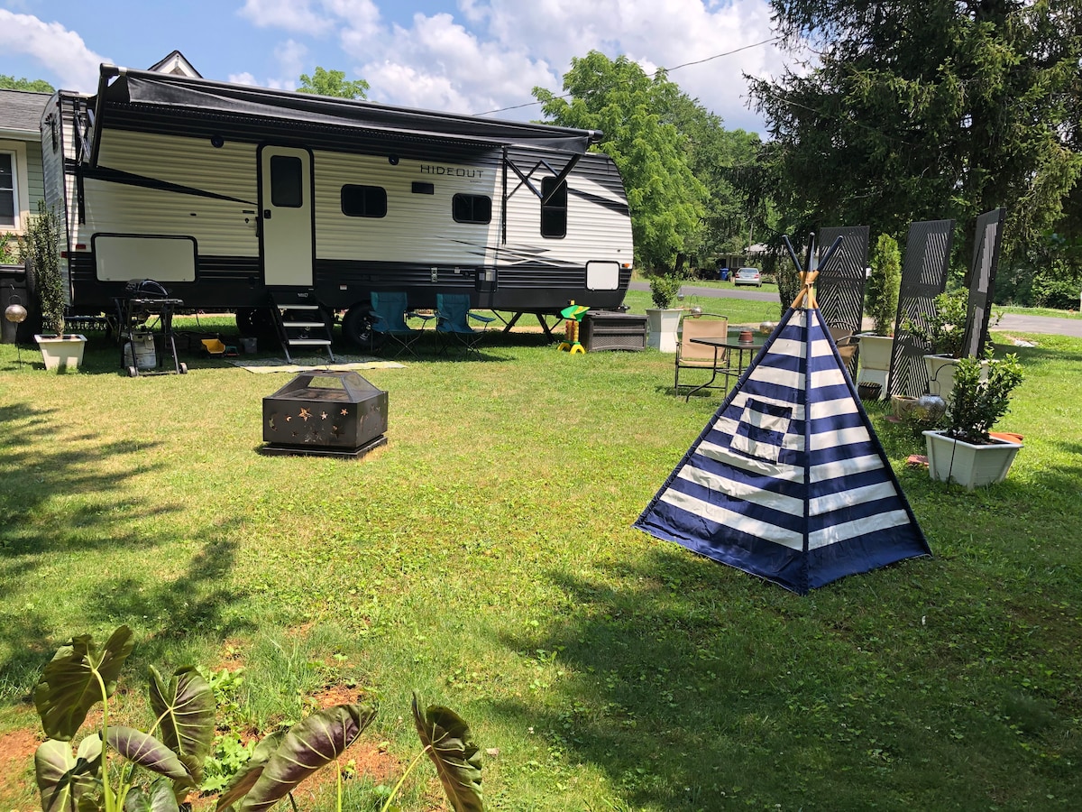 It’s 2021, 30’ camper with a slide out and full hook ups. You have a flat lawn area in the sun and shade trees all to yourself with a fire pit and outdoor seating area to enjoy. We’re located only 5 min. from the Asheville airport, and right in the middle between Asheville and Hendersonville, taking 20 min. to get to either downtown. You can enjoy many of the nearby forests: Bent Creek and Mills River are 15 min. away, Pisgah and DuPont are 30 min. away. It’s such a fun experience!