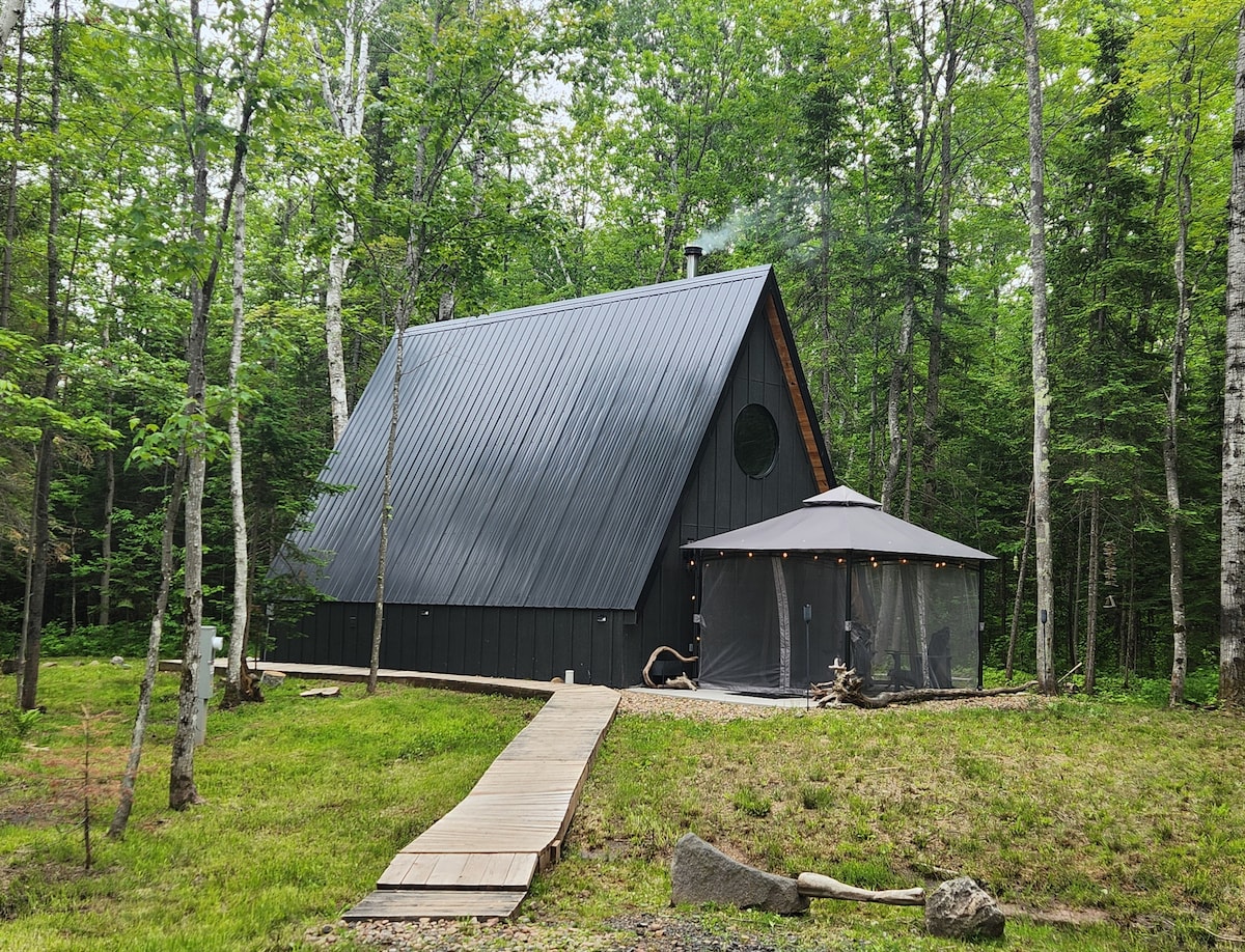 Modern, rustic, Aframe cabin on 10 wooded acres; beautiful, simple décor, fully equipped kitchen, all appliances, glass stove top, airfryer oven, filtered H2O/ice maker. Enjoy a luxurious bathroom, with a heated tile floor, walk-in shower. Towels, shampoo/conditioner/bodywash are provided. King bed in loft and NEW king gel memory foam bed on main floor. Smart TV, wifi. Books, games Woodstove heats the cabin perfectly in the colder months. All wood provided. There is a minisplit heat/ac unit.