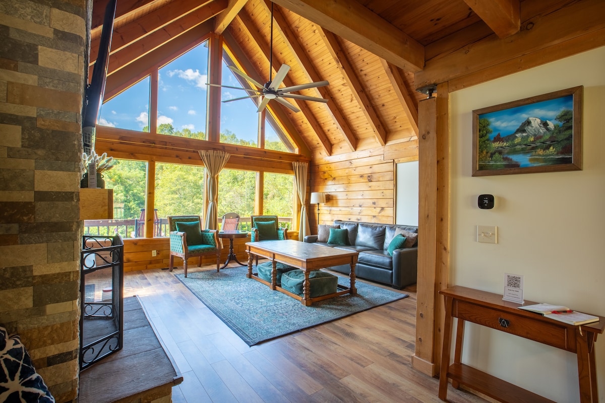 The Cabin is a fully furnished , 3 bedroom home on 13 acres, a pond 2 fire-pits, wildlife. The house has a gas fireplace, and a fully stocked kitchen, also we provide a gas grill outside on the wrap around porch. The porch has a swing and plenty of seating. A wash room with full size washer and dryer. The pond has a dock and is fully stocked. A king master suite with a shower ,bath tub. A bunk room w/ 4 long bunks. Upstairs a balcony / queen bedroom overlooking the downstairs.