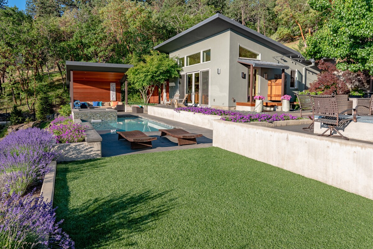 The Aloha House is located just above the University and only 1.5 miles from downtown Ashland. Nestled up a hill in the forest, you'll be transported to your own little private resort-like getaway with stunning views, architectural design that brings the outdoors in, and ample space for dining and entertaining poolside. The property consists of two separate studios (both included) connected by a unique outdoor living space with a seasonal pool, spa, outdoor shower, bar & BBQ, and more!