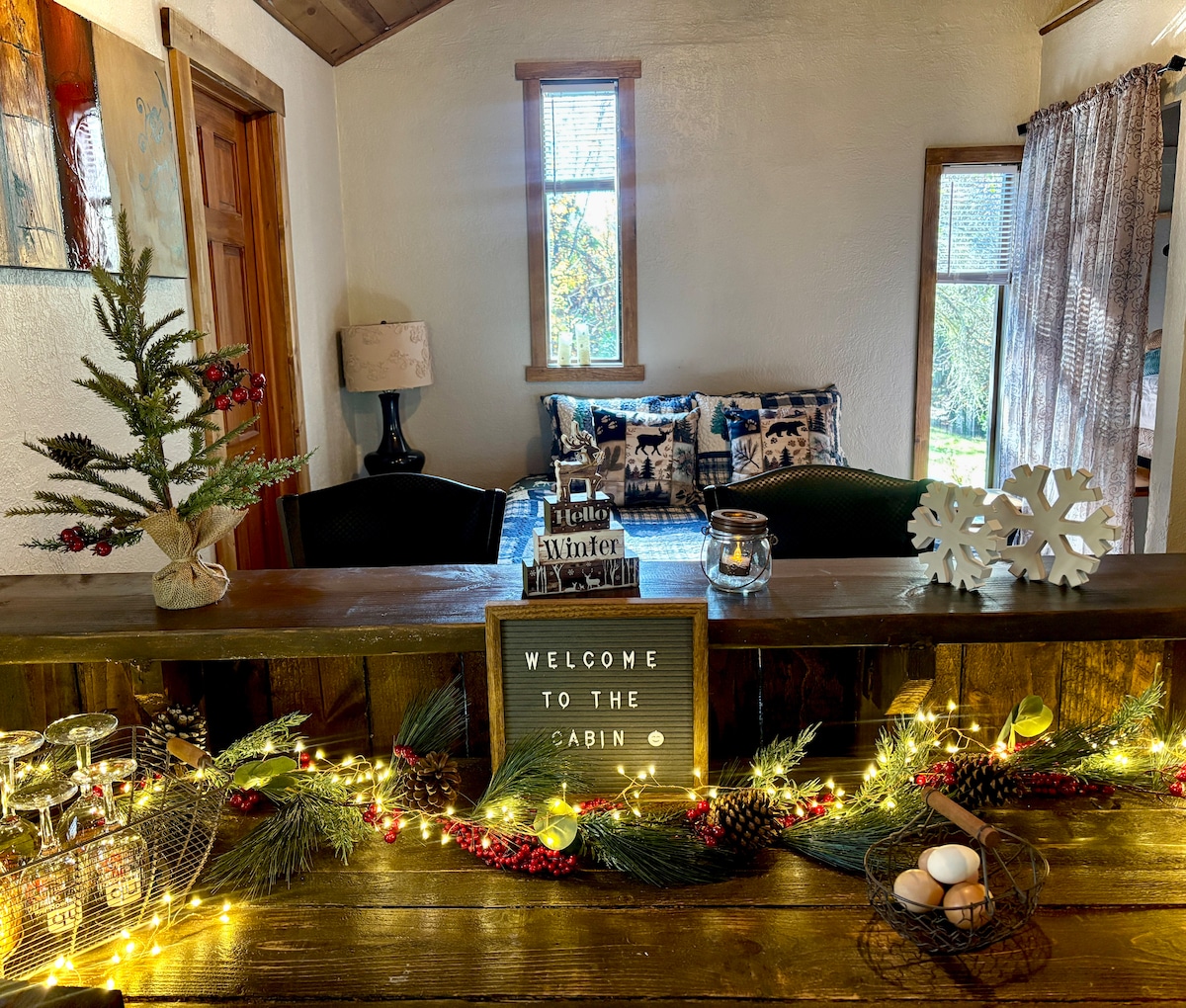 Take it easy at this unique and tranquil small studio cottage getaway. Our guest cabin is perfectly located minutes off the 5 freeway and just 3 miles from downtown Ashland's Shakespeare Festival, Plaza shops, beautiful Lithia Park and Restaurants. Venture to local lakes including Crater Lake, historic Jacksonville, and wineries in the picturesque Rogue Valley from our central location. Enjoy the privacy of our gated property with peaceful surroundings! Pets accepted with pet fee.