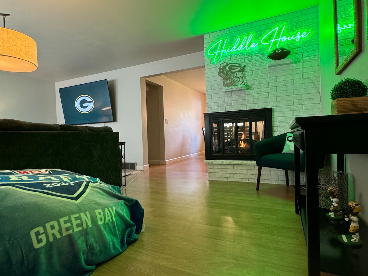 Take it easy at this unique getaway with a vintage vibe and within walking distance of Lambeau Field. Enjoy this clean, three bedroom, one and a half bath ranch house in a quiet neighborhood. Each bedroom has a TV and hotel grade pillows. Two big screen TV's are in the living room and family area off the kitchen. Upstairs laundry available, as are utensils and dishes. Up to two dogs allowed on leash when outside. Garage and basement not accessible at this time. Internet access. Code entry.