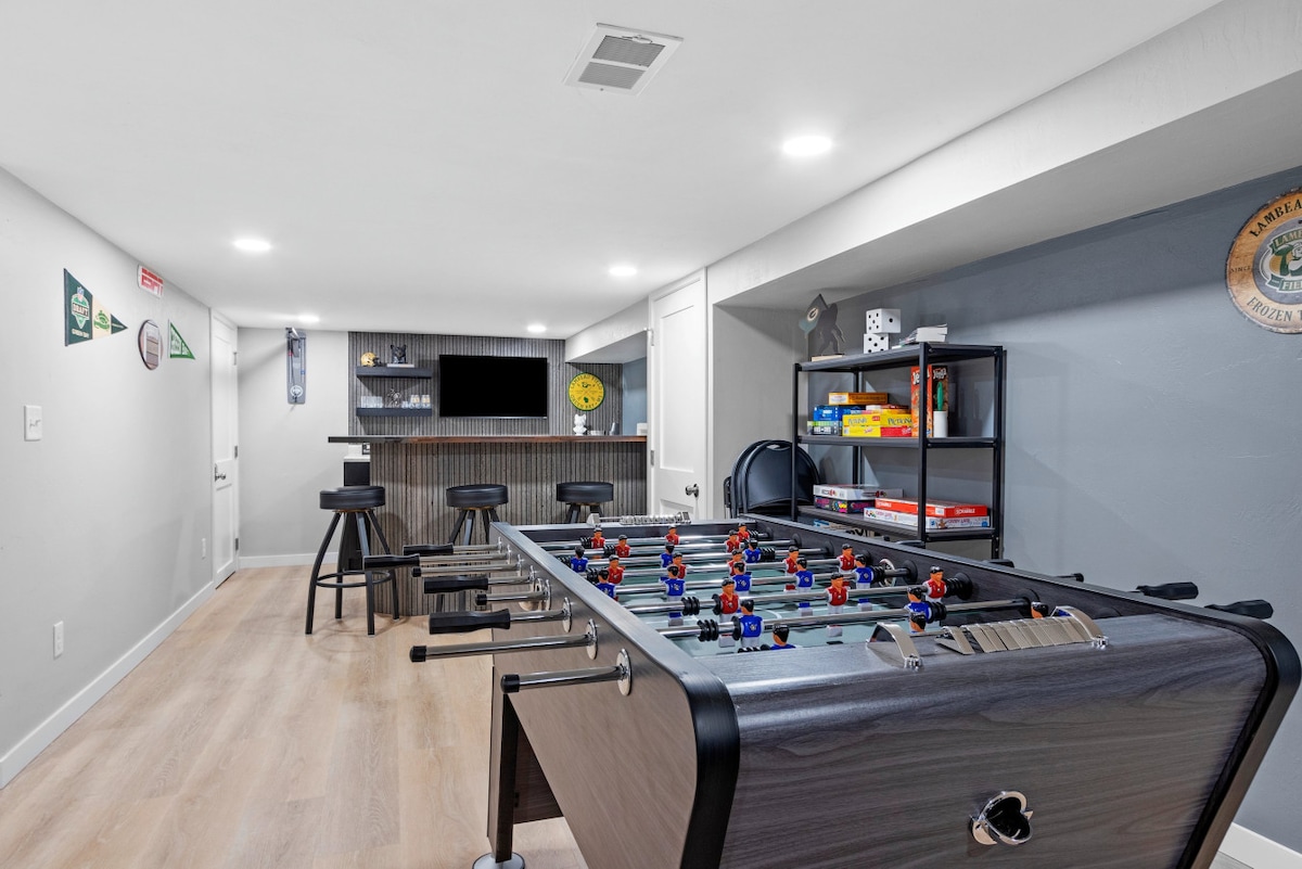 A skip away from Lambeau! This house can sleep and entertain your big group under one roof with 13 beds and an additional 2 fold outs (4 kings, 2 queens). Three full baths. Lots of places to gather. Large living room on main level. Loads of games, more TVs, and living room in basement too. Garage has porch on back and is set up for more entertaining, with a view of Lambeau! This is the ultimate social distance place!