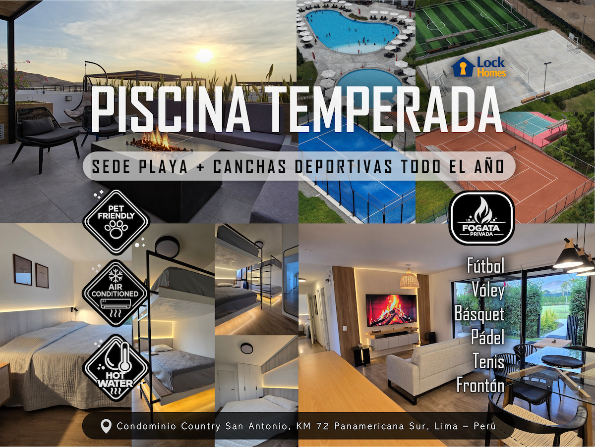 Casa de campo frente al mar(km 84.4 Panamericana Sur). 1000m² de áreas verdes, piscina temperada y parrilla. 6 dormitorios (3 en suite): 5 con 2 camas dobles, 1 con cama doble y cuna; hasta 20 personas. Mesa de tenis, sapito, internet y TV. Condominio con laguna natural,ideal para birdwatching,juegos,market,seguridad 24/7(restaurante verano).Delivery Wong/Vivanda. Acceso directo a playa(olas fuertes). A 5 min de Totoritas y La Ensenada, a 10 del Boulevard de Asia y a 30 de Calango y Azpitia.