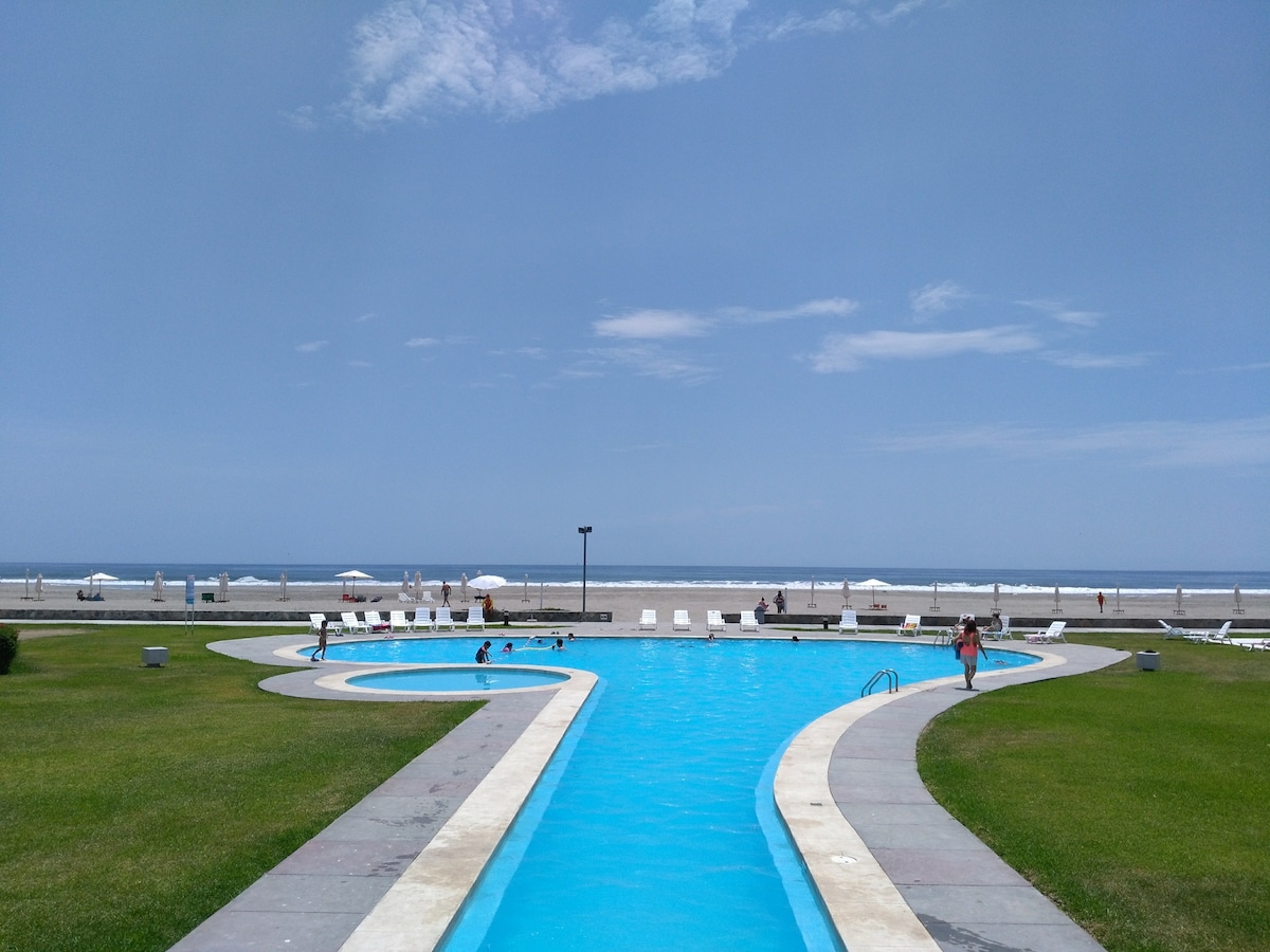 Departamento de nuevo con vista al mar, a 5 cuadras de la playa. Cuenta con 2 piscinas , área de parrillas , cancha de fútbol , básquet juegos para niños e ingresos para personas con discapacidad , si buscas celebrar tu cumpleaños , una escapada romántica, o estar con la familia este es tu lugar, disfruta del nuevo mall Punta Mar a solo 5 minutos y el centro comercial KM 40 con variedad de tiendas como Wong y el Gimnasio Smart Fit , además de variedad de discotecas.