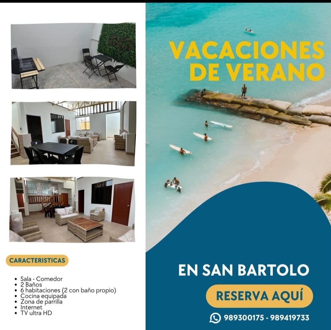 Capacidad 10 personas Acceso directo al mar. 🛋️ Amueblada y equipada. Agua Caliente, Terma 2 estacionamientos 1er piso: Sala, comedor, kitchenette, 3 habitaciones, 2 baños completos, lavandería y patio. 2do piso: Terraza grande con parrilla y sombrilla. Acceso de los huéspedes El Condominio cuenta con: ⛱️2 piscinas, 1 para adultos y 1 para niños. Minimarket, Restaurante,Juegos para Niños. 🎾 9 canchas de tennis 🏓 Fronton 🥅 2 canchas de futbol 🚨 Seguridad 24 horas No se aceptan mascotas