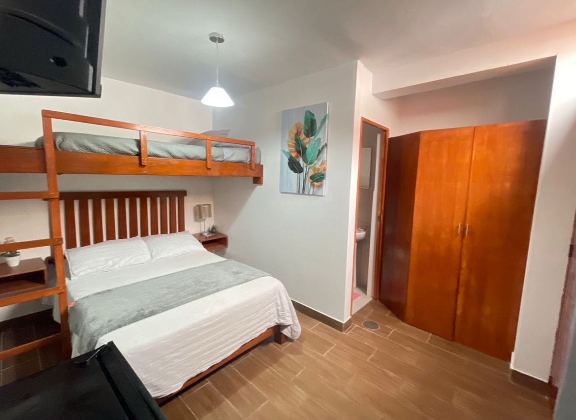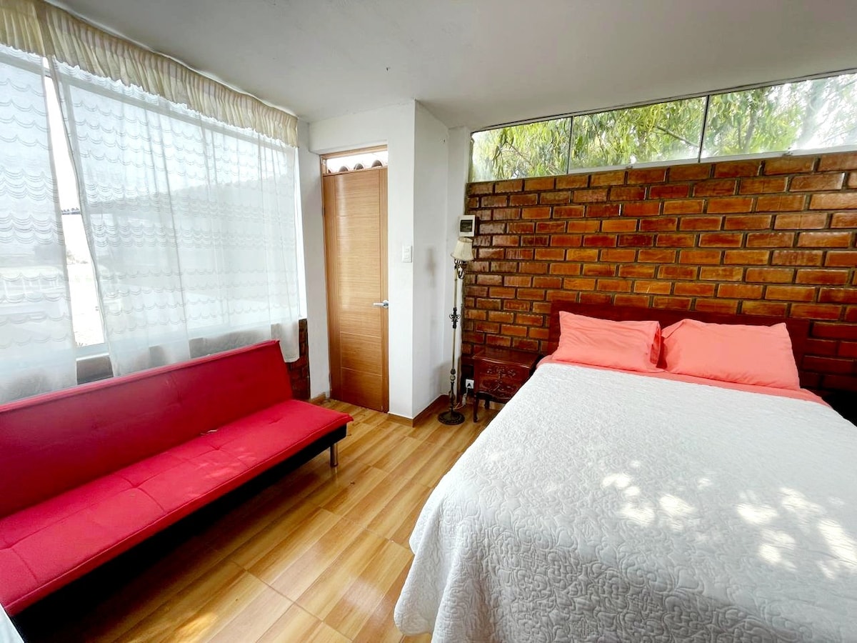 Hermoso Loft 5 piso sin ascensor cómodo y seguro, salita con sofa cama y TV Smart de 50" internet rapido y exclusivo. Pequeño y con todo lo necesario, el baño es de uso único de los huéspedes con ducha y agua caliente y esta fuera del ambiente principal (a 1 mt), el dormitorio tiene acceso por una escalera tipo gato con una claraboya que mide 0.60x0.60, 1 cama de 1 1/2 pza y 1 cama de 1 plaza, ducha española con agua fría, terraza de uso exclusivo. Cámara exterior en entrada del edificio