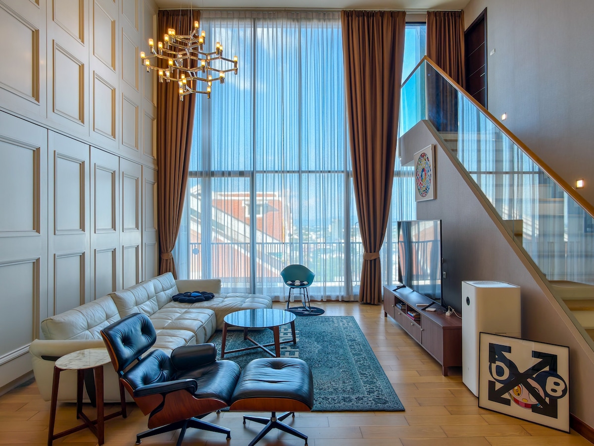 这套房源是Astra Condo 最具代表性的高端住宅。 这套 150 平米的顶层复式两卧三卫豪华套房位于公寓顶层(16楼),曾经是公寓的“楼王”户型,以罕见的空间尺度、7 米挑高中庭、整面落地玻璃以及极佳的自然采光而著称。房间整体采用轻奢现代设计风格,从家具到灯光都极具质感,让您在清迈享受到酒店级的舒适体验。 进入客厅的第一刻,挑高与落地窗带来的气场会让您眼前一亮。客厅、餐厅、厨房与吧台区空间宽敞通透,非常适合家庭、旅游与商务人士。两间卧室均为独立空间,并配备三间卫生间,让多人入住也能拥有绝对的便利性与私密度。 本房源所在位置极佳,距离公寓顶楼的无边泳池与健身房仅 15 米,您可以随时前往游泳、运动或放松,体验更轻松的度假氛围。 📍 关于 Astra Condo 位于清迈市中心长康路,是最受欢迎的高端公寓之一。公寓环境优雅、安全,24 小时安保、完善的公共设施,并拥有城市中少见的顶楼无边泳池与专业健身房。 地理位置优越,购物娱乐非常便利:楼下便有7-11便利店;步行 5~8分钟即可到达Big C Pantip市场和清迈夜市;距离古城、塔佩门、机场均只需几分钟车程。