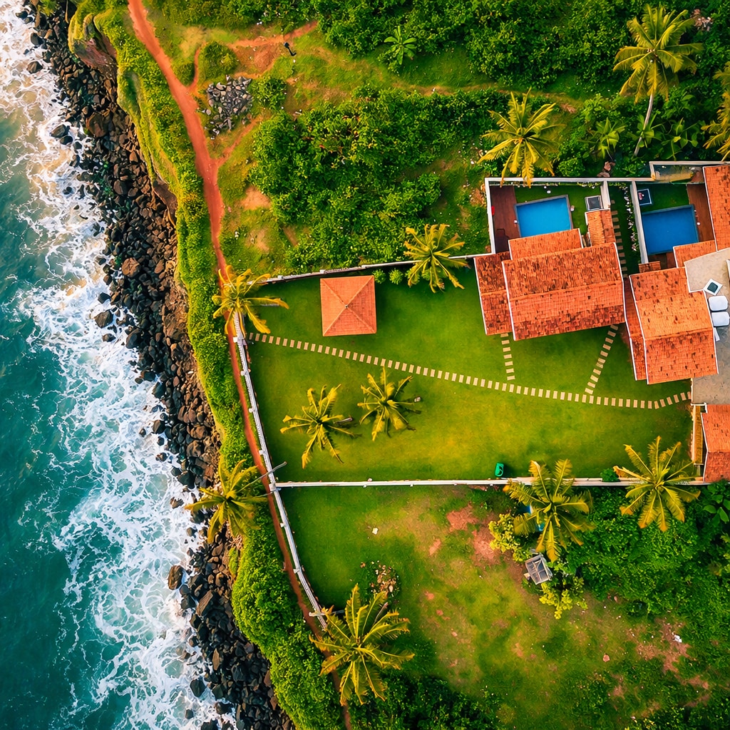 Brand new cliffside luxury private pool beachfront villa resort in Edava, just 4 km from Varkala, Kerala • Natural wooden flooring/ elegant wooden interiors • Private ocean view pool with breathtaking sunsets • Open sky barefoot shower & lush private garden • Perfect for honeymooners, families & soulful escapes • Dedicated villa host, private chef, security with personalized dining experiences • Guests can enjoy complimentary breakfast served each morning, freshly prepared local option