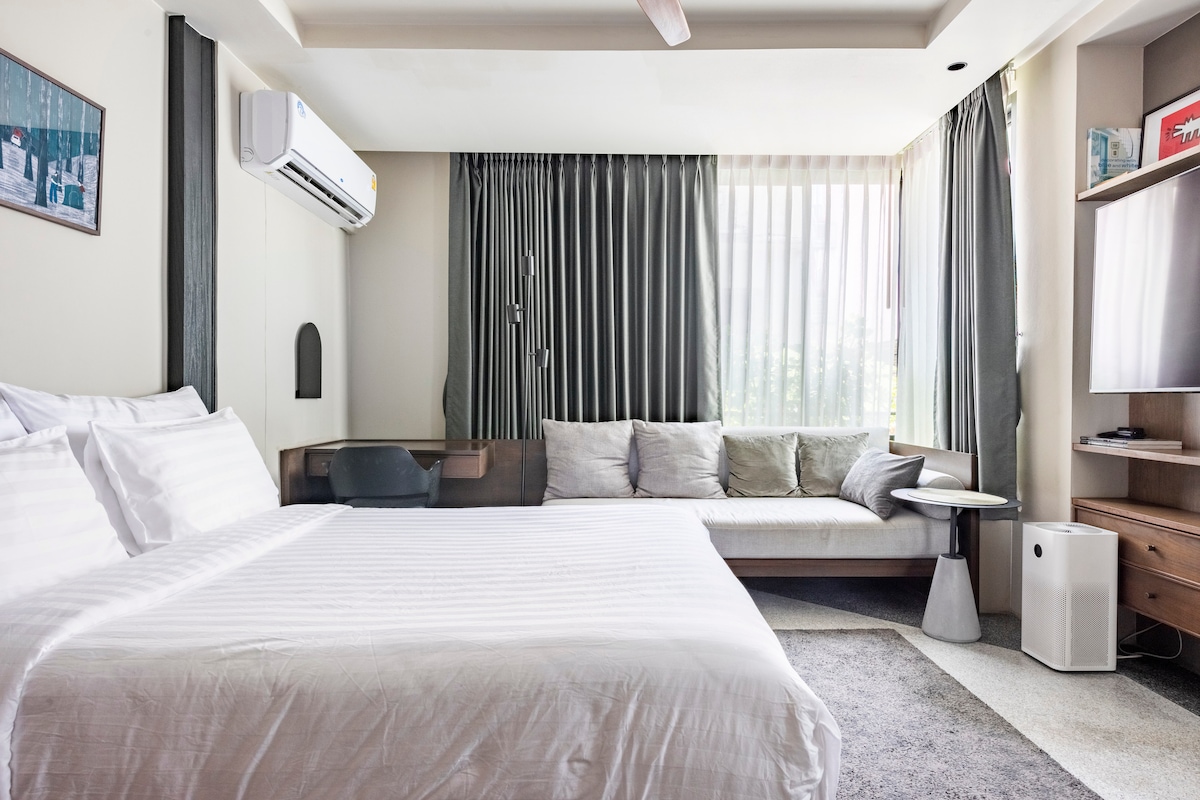 Enjoy the modern natural experience at this centrally-located place. This room also feature a sofa bed, Smart TV with Netflix, kitchen, stepping garden and outdoor living balcony. 2nd floor (no elevator) ***Parking is limited*** Parking fee : 100baht/day Please book parking in advance