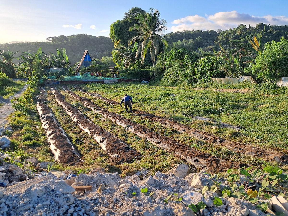 Bahay kubo in a small vegetable mini-farm overlooking Taal lake and volcano, with nearby riverstream. Walking distance (300 meters) from national highway of Tanauan- Talisay boundary, along barangay San Jose road. Across Diwatang Parang bougainvillea garden. Tagaytay midlands can be viewed in the distance, and Tagaytay be half hour away by own vehicle via Talisay- Sungay uphill. Farm stop and stay with bird watching, serene view of Angasin hill.
