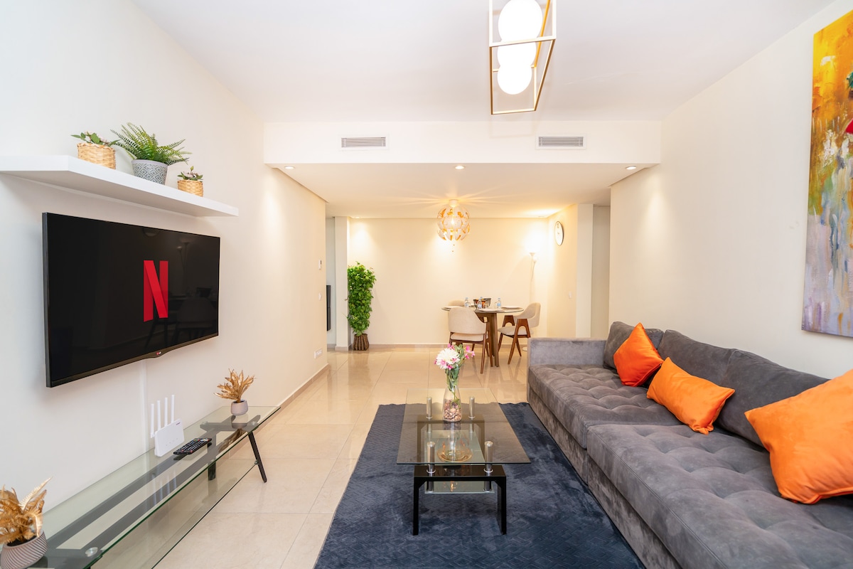 Welcome to our luxurious two-bedroom, two-bathroom apartment located in the prestigious Burj Al Andalous in Tangier. This upscale property is situated in one of the most sought-after areas in the city with 24-H concierge a few minutes walk from the Train Station, City Mall, beautiful beaches, and high-end hotels, offering convenience and luxury at your doorstep. We offer premium services: fibre optic WiFi. Chauffeur and a traditional Moroccan breakfast by our local governess (additional cost).