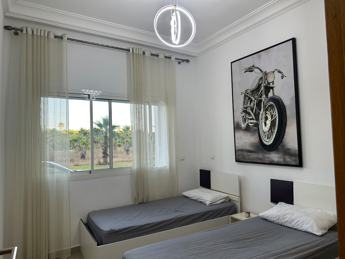 Profitez d'un séjour en famille inoubliable dans ce logement chic à Tanger . Idéalement situé à proximité de l'hôtel Farah,et au coeur de la zone Ghandouri à Tanger, cet appartement moderne offre une vue imprenable sur la mer et se trouve à quelques pas de nombreux cafés et restaurants animés. À l'intérieur, vous découvrirez un salon confortable pouvant accueillir jusqu'à 5 personnes, 2 chambres spacieuses, une salle de bain, une cuisine entièrement équipée et deux balcons pour admirer la vue.