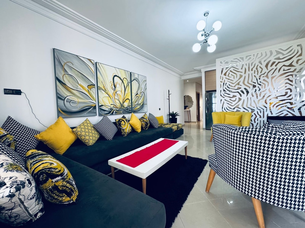 The apartment has 3 bedrooms close to all sites and amenities. • 3 min walk to the beach. • 1 min walk to the Corniche. • 10 min walk to TGV station & City Mall Tanger. • Secured building 24/7 (camera at entrance & concierge). • Free parking on site. • Outdoor pool 5 min walk. • Pool open July & August only. • Pool for all. Free swim for 4 people, then 40 DH/extra person.
