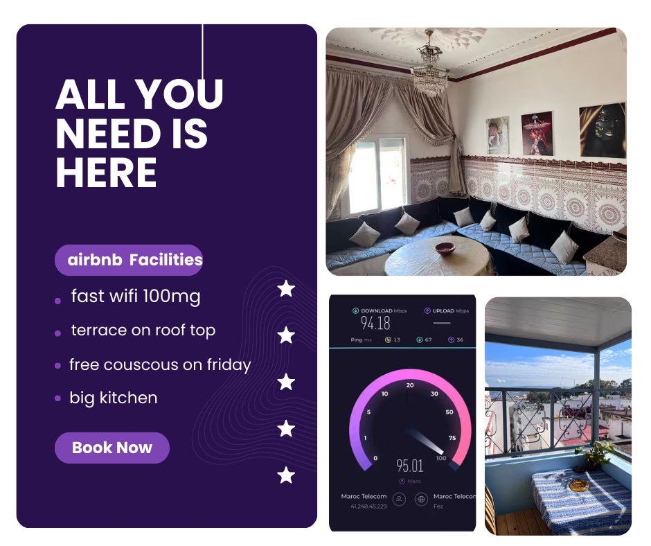 Séduisante et spacieuse maison de l’ancienne médina de Tanger dotée d'un rooftop avec mini piscine. Avec ses 3 jolies chambres doubles, ses 3 salles d’eau, son agréable et spacieux espace de vie en enfilade (cuisine, salle à manger, salon), sa cuisine d’été et ses 2 toits terrasse (80m²), l'un avec piscine, l’autre offrant une très belle vue sur le détroit de Gibraltar, elle est idéale pour les couples, familles et groupes d'amis. Accès facile à tous les sites et commodités depuis la maison.