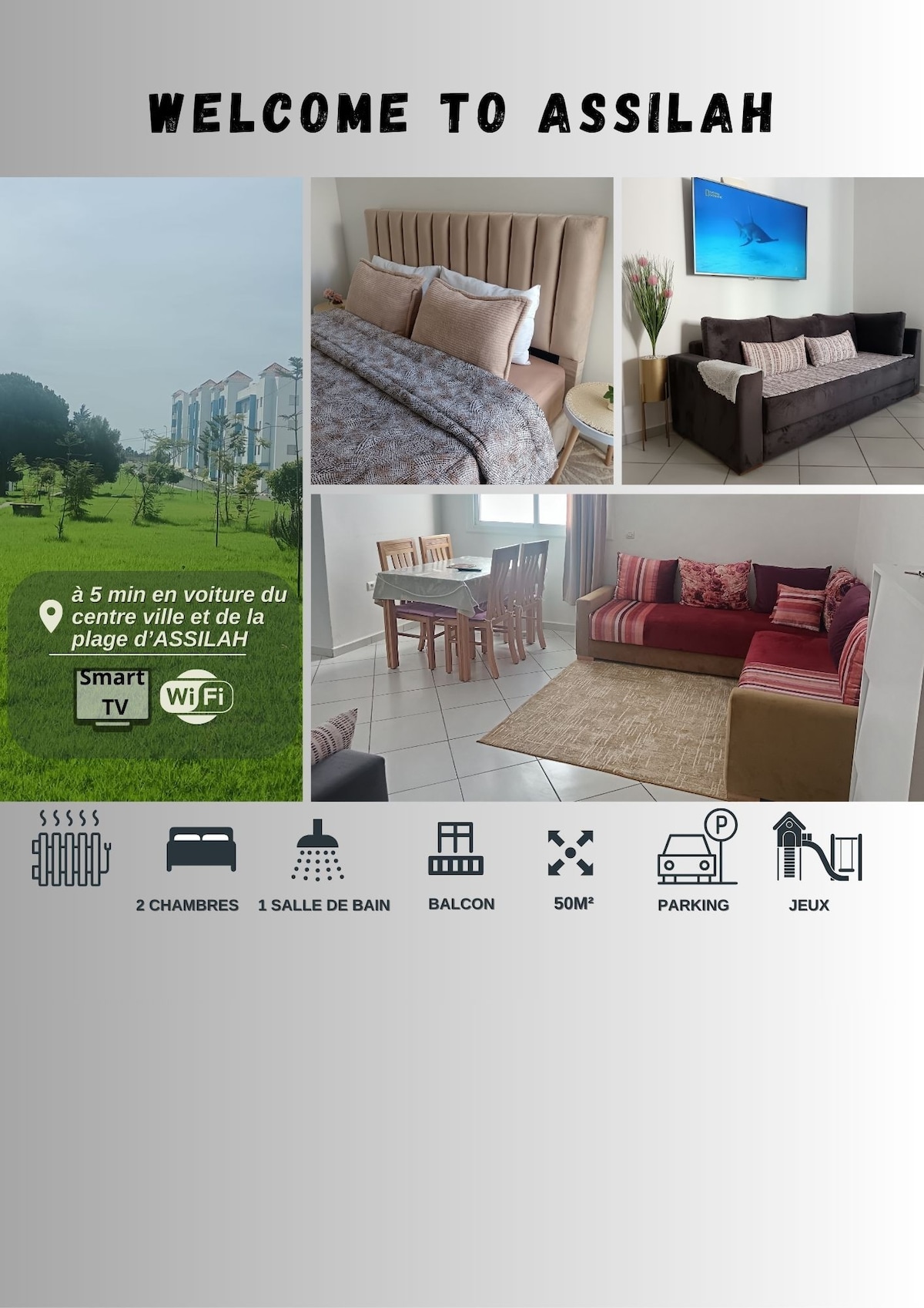 a quiet and de-stressing place with a touch of nature, Welcome to our 2 bedroom aprt in assilah : - in 2d floor,500 m from highway A5, 5 min to the center and beach, - tow pools, -watch your children in the pool from the balcony; - mobile wifi routeur;android TV 55, -2 spacious rooms + 3 beds one for baby; - fully equipped kitchen with electric stove; - can host up to 6 guests + 1 bed for baby; - 24/7 security+ free parking; - grocery store inside -maintained garden - children's play area