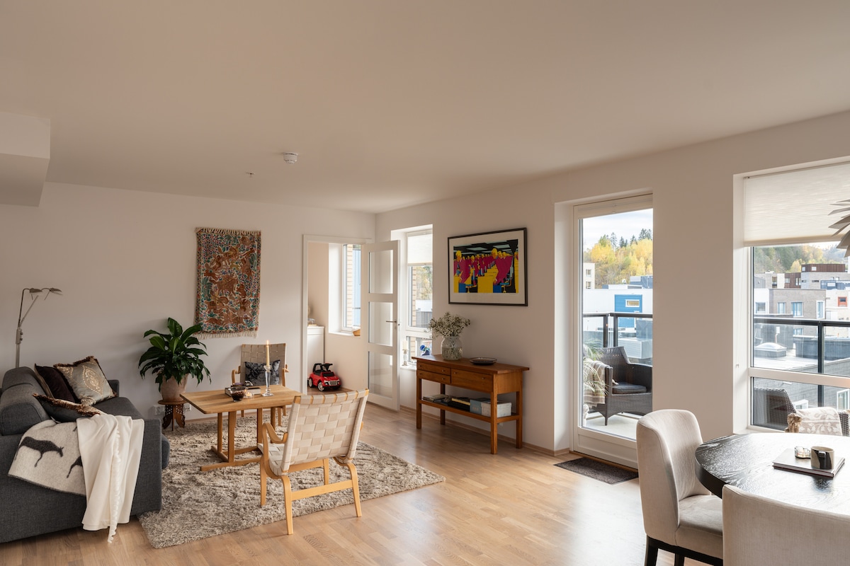 Stay in a newly renovated, stylish and bright apartment surrounded by flowers in a quiet neighbourhood near Oslo. Towels, bedlinen, soap, and more is included. The apartment has a fully equipped kitchen, comfortable living room with sofa bed, brand new bathroom with washing machine, and one spacious bedroom with a comfortable bed and a large cupboard to put your things. Perfect for a relaxing stay and easily accessible to Oslo. Free parking onsite. Work space with extra screens available.