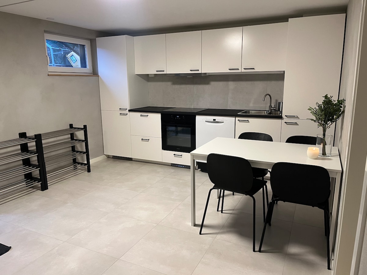 Ny og moderne leilighet med egen inngang. Full møblert, 65m2 Vannbåren varme i hele leiligheten Sprinkel anlegg. Gratis uteparkering for en bil. 500 meter gåavstand til Asker sentrum. 700 meter gåavstand til Asker togstasjon med flere tog forbindelser, Kun 23 min med tog til Oslo S. Soverom 1: Dobbeltseng 180/200 og åpen garderobeskap løsning Soverom 2: familieKøye 80/200 og 150/200. Åpen garderobeskap løsning. Stort bad med vaskemaskin. Kjøkken med alt utstyr man trenger for å lage mat.