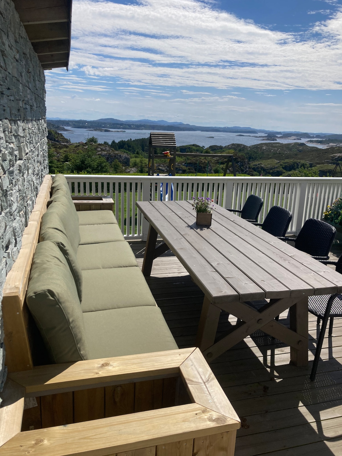 Nyt luksus ved sjøen på idylliske Herdla! Vår nyrenoverte og romslige hytte har fem soverom, 16 (18) sengeplasser, to baderom, to dusjer, badekar, to toalett, vaskerom, stort og godt utstyrt kjøkken, sauna, jacuzzi og egen kai der du kan bade, fiske og nyte utsikt over vågen. Her finnes mange kjekke leker både ute og inne. Perfekt for familie og venner. Sauna, jacuzzi, sengetøy og håndklær er inkludert i leien.