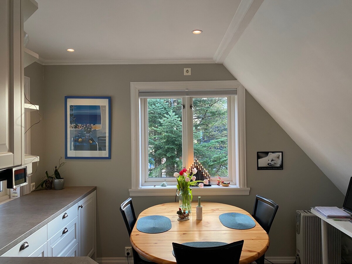 Lad batteriene på dette unike og rolige overnattingsstedet. Nyt sjø utsikten enten ved kjøkkenbordet, stuebordet, i utestue eller på en av hagens flotte uteområder. Tenn i peisen som er gjennomgående fra kjøkken til stue, eller ta deg et deilig bad i det gammeldagse badekaret med løveføtter. Huset ligger i et fredelig strøk, samtidig som det er sentralt. Kun 30 min. å kjøre til Bergen, og 10 min. kjøring til Knarvik senter. Gåavstand til nærmeste Kiwi butikk.