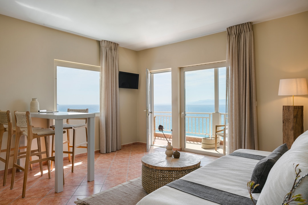 Mezzanine one bedroom apartment with daily a lacarte breakfast at JoyBistro. This apartment is furnished to a high standard and provides a comfortable base to enjoy spectacular sea and countryside views. It accommodates up to 3 guests. The mezzanine layout features a double bedroom upstairs, while the ground floor includes a kitchenette, open-plan living area with a sofa bed, dining area, bathroom and terrace. Cozy, well equipped, and ideal for self-catering, it’s a perfect home-away-from-home.