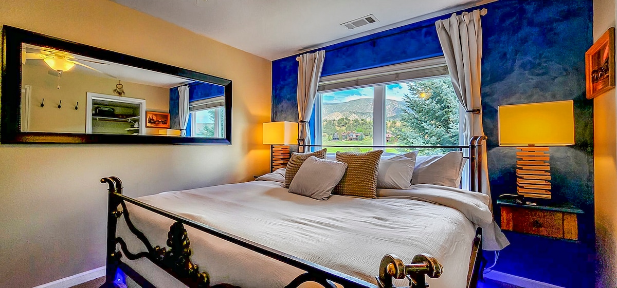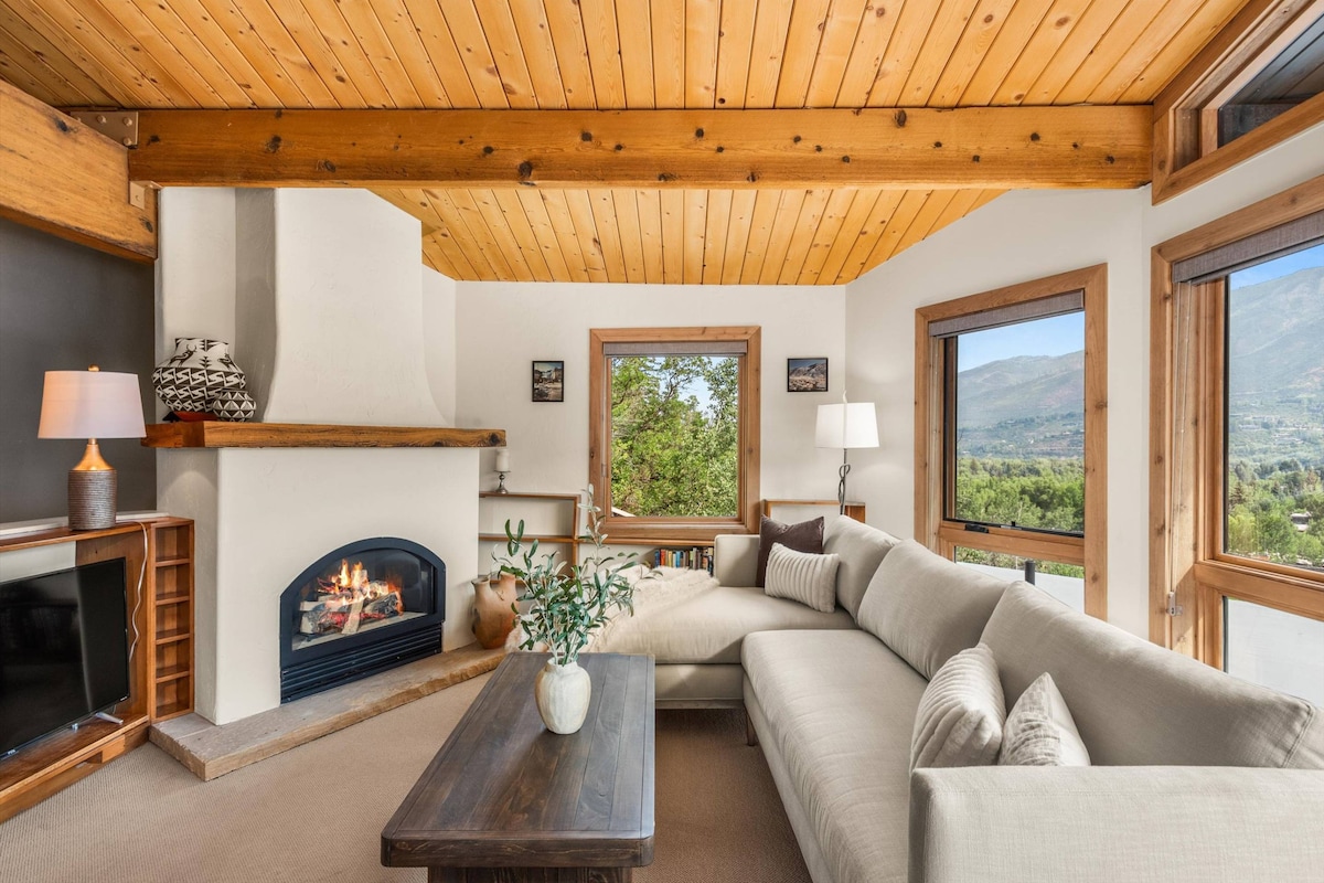 Stylish LARGE studio condo. Newly remodeled. Corner unit. Located in downtown Aspen's central Core in a quiet beautiful neighborhood with a facing view of Smuggler Mountain. Large sliding glass doors walk out to a spacious patio & green space. Across the street is the Roaring Fork River, hiking path & bridge. 2 blocks to all the shopping, restaurants, nightlife, skiing, hiking & biking. Gondola is 6 blocks away, Wood Burning Fireplace, FREE Parking, Washer/Dryer, Ski Locker.