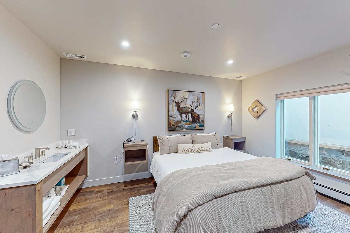 Stay in tasteful luxury just steps from Snowmass Village Express and Snowmass Mall. This beautiful studio condo is exquisitely furnished with an effortless blend of rustic and modern finishes, with tons of natural light from its six large windows. No need to drive to the ski hill! Put your gear on at the unit and walk just 100 feet to the slopes. In the summer, there's equally easy access to the best hiking and mountain biking in Snowmass. Welcome to your own alpine Paradise!