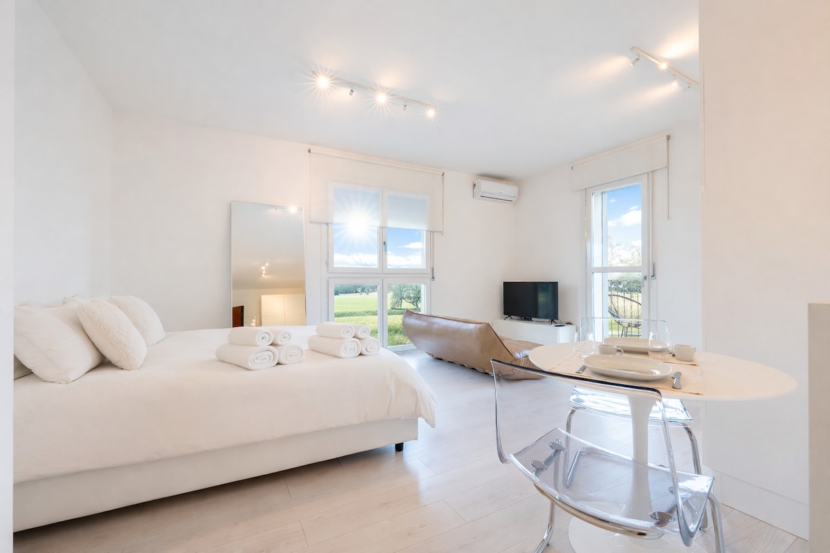 Appartamento moderno e luminoso ad Assago, in via Giacomo Matteotti, ideale per soggiorni di lavoro o di piacere. Gli ambienti sono arredati in stile contemporaneo, con colori neutri e dettagli di design urbano. La zona giorno è un open space con cucina a vista completa, penisola con sgabelli e area living con divano e TV. Camera matrimoniale spaziosa con armadi e bagno moderno con doccia in vetro.