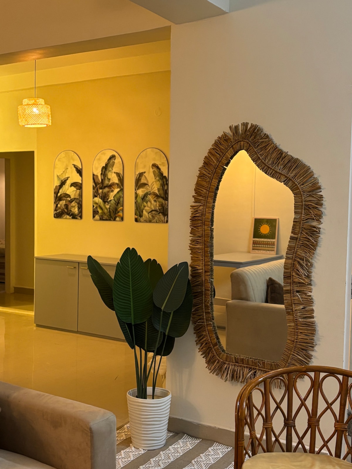 Experience a Bali-inspired retreat in Guwahati with modern interiors, a duplex double-height ceiling, and abundant sunlight. This apartment blends Assamese and Balinese cultures, featuring two bedrooms, a common washroom with a changing area, and lush indoor plants. Located in a posh neighborhood, you’ll be steps away from shopping malls and restaurants. Enjoy a cinematic experience with a 65-inch TV, and relax with attentive caretakers offering room service for your convenience.