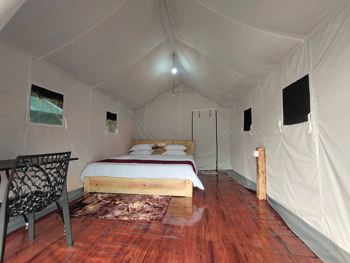 This Jungle Safari Tent is 13 feet up from the ground, the Tent has a beautiful river view from the balcony. The uniqueness of this tent is - it's has an attached washroom with no geyser and the view of the crystal clear river. The spacious room can be accessed via the steps from the side of the Tent. The room is attached with a spacious bathroom and provided with basic amenities. The adventure activities are available at an extra cost.