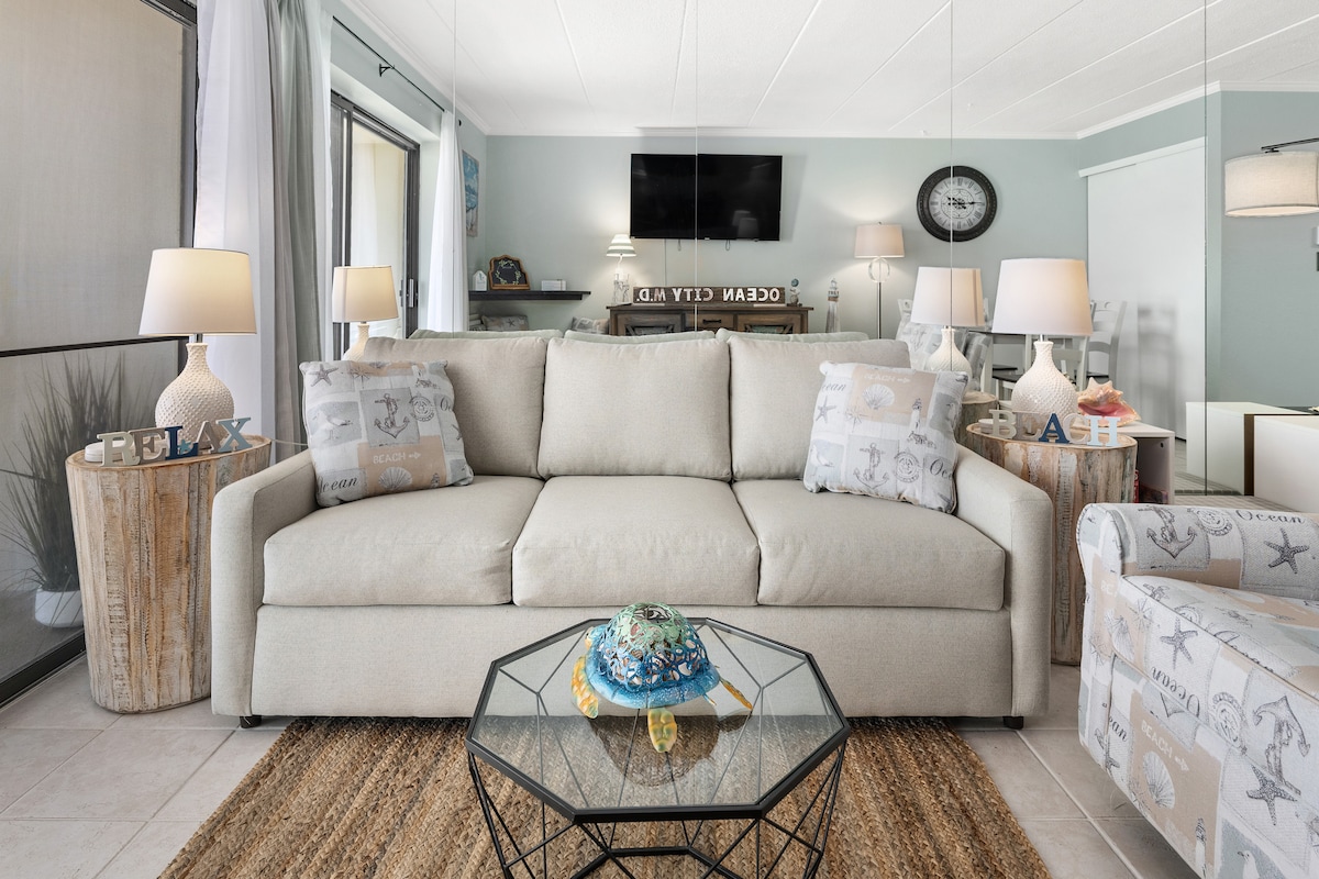 You've never seen waterfront like this. Welcome to Edgewater Escape, a luxury bayfront loft apartment that hangs entirely over the bay on 7th street in downtown Ocean City. Sit on the bay front porch or hang out inside and watch boats, dolphin, birds, and sometimes even seals swim by within feet of the porch. The loft has a roomy king sized bed and the downstairs couch pulls out into a comfy queen bed. Recently renovated, it comes fully equipped for your big trip or quiet staycation :)