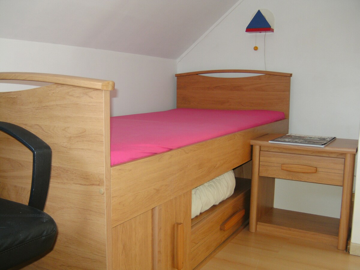 Bijgebouw in de tuin van een open bebouwing in een rustige buurt. De woning beschikt over een eigen keuken, living, slaapkamer, badkamer en privé terras. Privé parking en een afgesloten berging voor fietsen is beschikbaar voor gasten.(stopcontact voor het opladen van de batterij FIETSEN in de fietsenstalling)