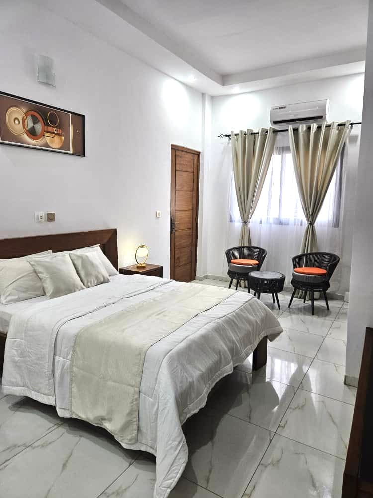 Détendez-vous dans ce grand studio climatisé calme moderne et élégant . il possède une cour extérieure privée équipée d un spa et d un salon de jardin pour profiter des joies de l'exterieur . il est situé à 5 à pieds de nombreuses commodités ( boulangeries, superettes, restaurants, espace musical, pharmacie, taxis, bus) et du village des artisans .A 10mn en voiture/ taxi des plages de Bassam avec ses restaurants de bord de mer. A 30mn de l aéroport et à 40mn d Abidjan (accessible par bus )