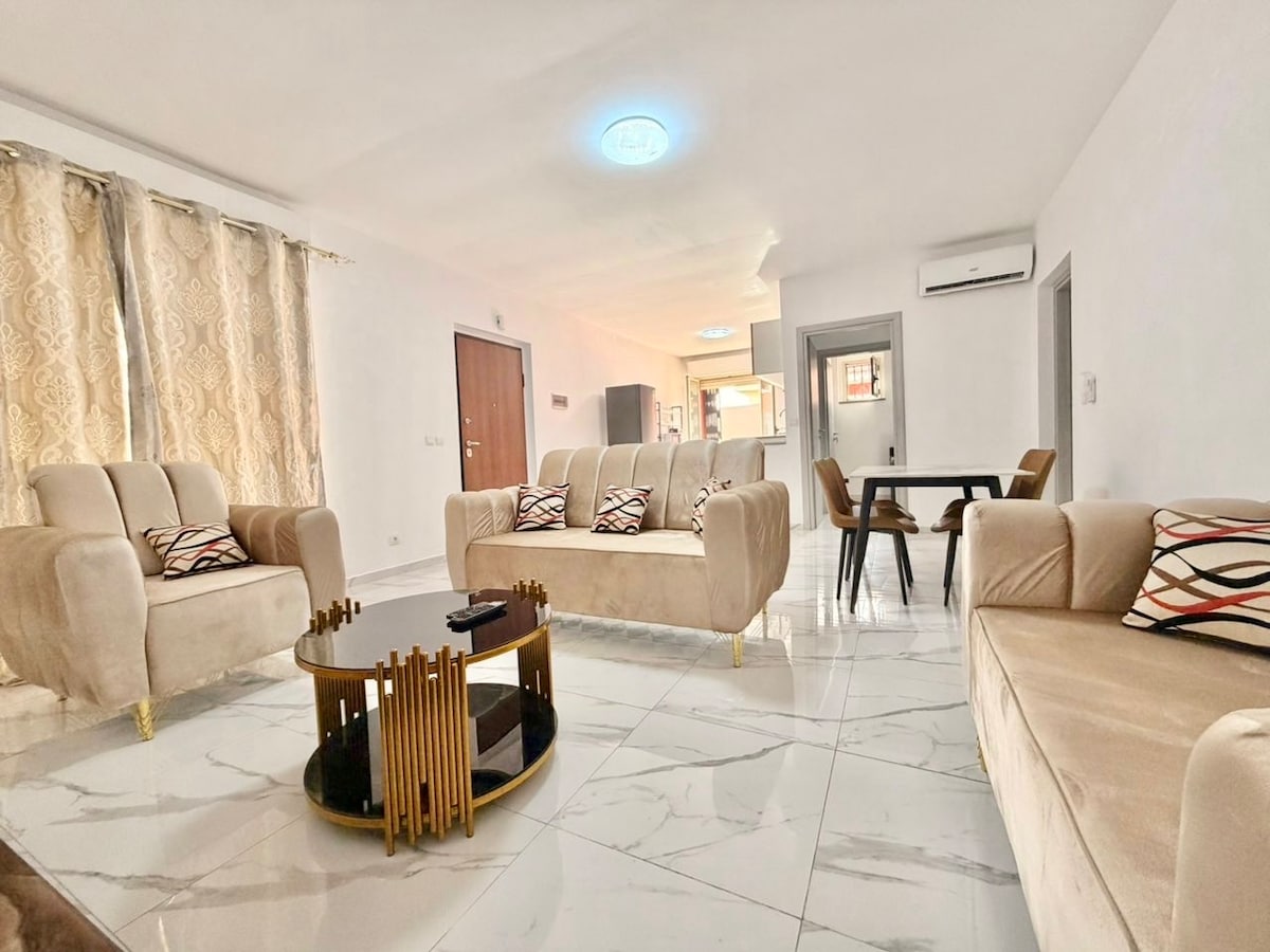 La villa Petite Palmeraie située à 20 min de l'aéroport, 12 min plage et 30 min zone 4 est entourée de palmiers est sécurisée par un système d'alarme périphérique. Elle est située dans une résidence très calme à l'abri de l'agitation urbaine. Accessible facilement par l'autoroute, la villa est paisible et élégante. Une charmante piscine est à votre disposition pour profiter en famille d'une eau agréable notamment lors de fortes chaleurs. Présence de petits restos (maquis) accessibles à pieds.