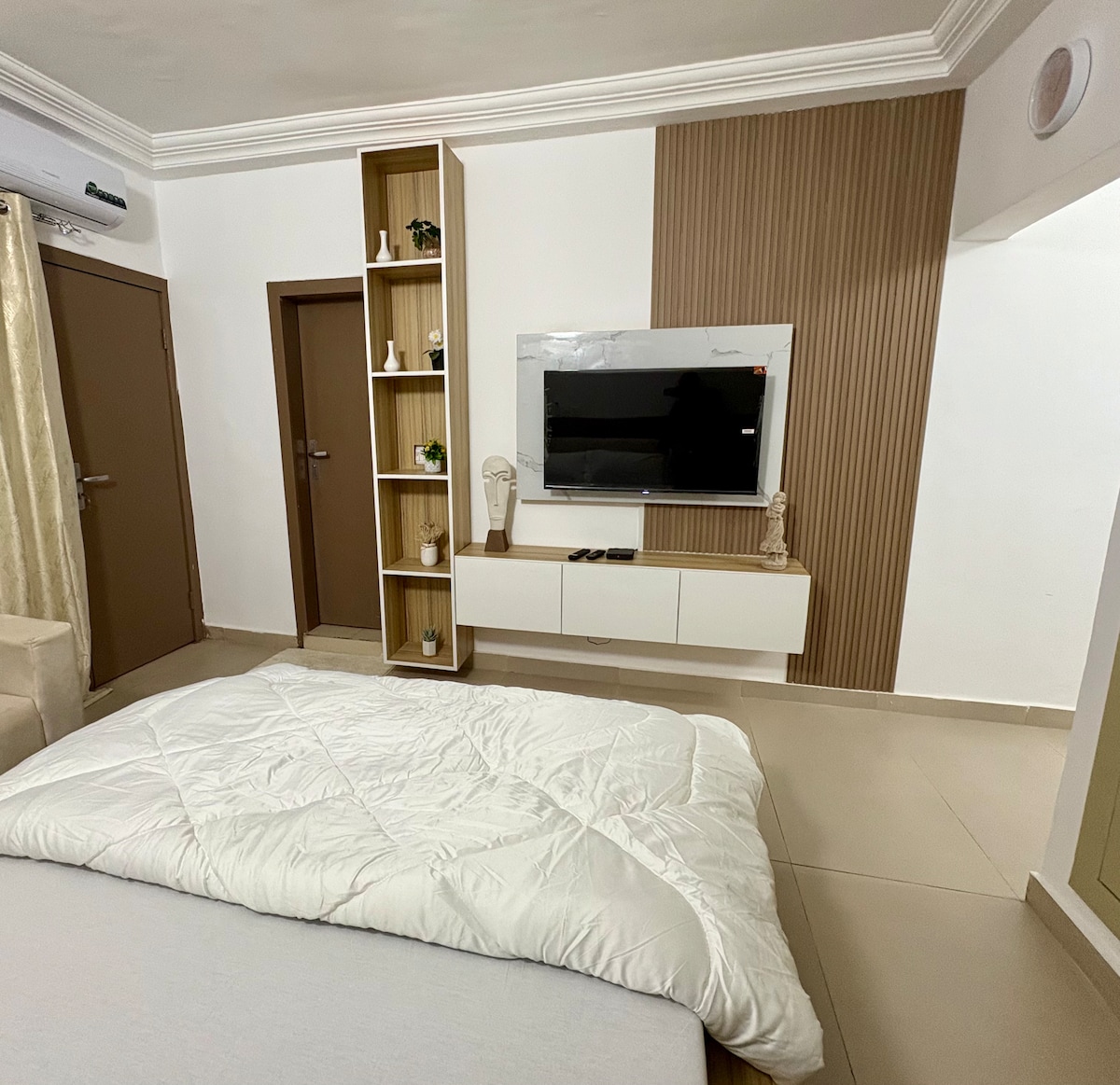 Bienvenue à Résidence HAYMES, Un appartement alliant élégance contemporaine, accents africains et haut de gamme. Niché au cœur du quartier calme de Mockeyville, ce cocon d’une chambre vous offre l’intimité d’un chez-soi, et le raffinement d’un lieu pensé pour se ressourcer. Style & Ambiance Décoration afro-minimaliste, lignes épurées, matières naturelles, objets d’art et mobilier recherchés pour profiter des chaleureuses journées, et des douces soirées bassamoises...
