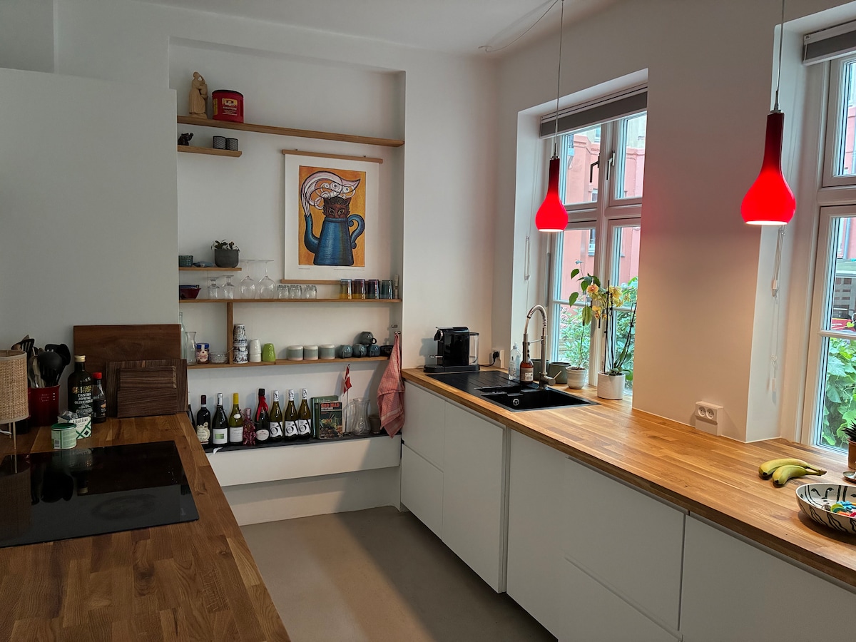 Enjoy a lovely Nørrebro apartement with a nice decor and a large bathroom. Look forward to sun on the two balconies all day long. Perfect location close to Metros, green outdoor areas and a lot of cafes and restaurants. Big living room with entrance, kitchen and access to balcony. Smaller TV room and a beautiful bedroom (bed 160) with access to balcony towards the yard. Bathroom with shower. Very cozy and lively neighborhood close to the Cementery Assistens and the hip street Jægersborggade.