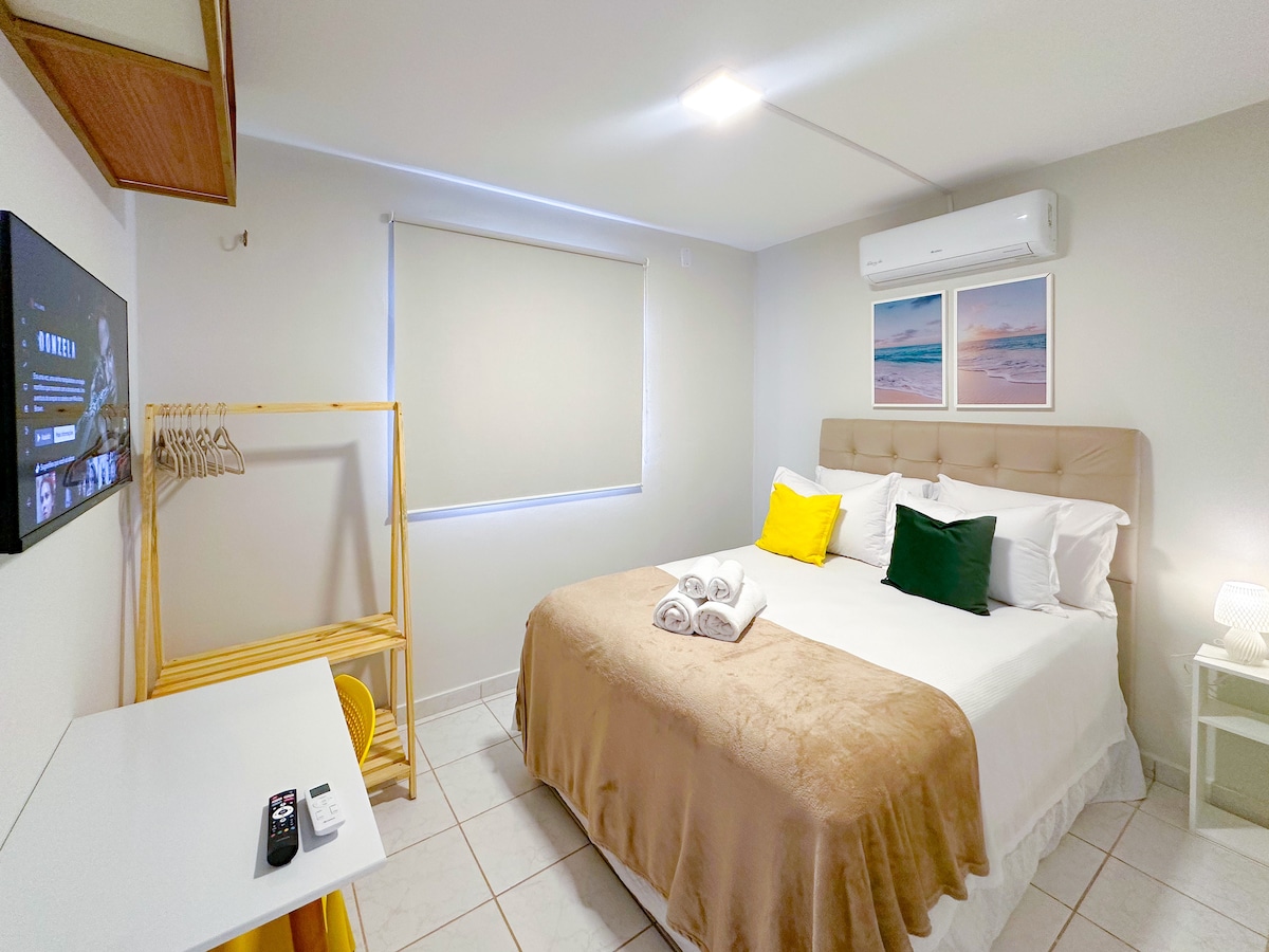 Diferenciais: Conveniência completa: ideal para curtas ou longas estadias, com tudo o que você precisa ao redor: supermercado, padaria, academia, lavanderia, lanchonetes, salão de beleza, farmácia e mais. Conforto e segurança: localizado no 1º andar com redes de proteção, portaria 24h, condomínio fechado e vaga de garagem gratuita. Tudo incluído: toalhas de rosto e banho, roupa de cama e cobertores para seu conforto. Fechadura digital com senha, garantindo um check-in prático e seguro.