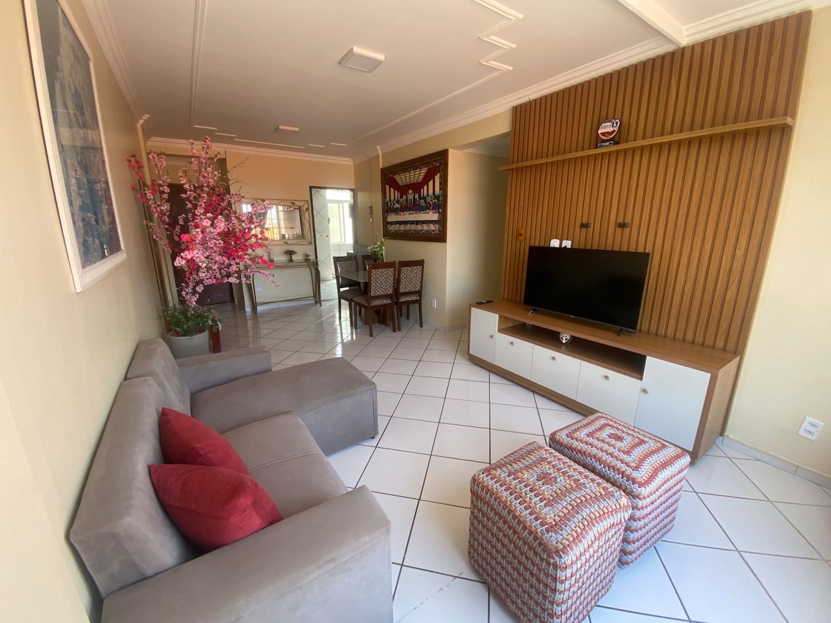 6x s/juros Chegue na praia da Litorânea andando em apenas 7 min! De carro são 2 min! Ar-condicionado em 2 quartos; Wi-fi 300mb; Máquina de lavar; Ferro; Smart-TV; 3 quartos amplos; Cozinha completa; Roupas de cama e toalhas de banho; Ao lado tem uma academia SmartFit, farmácia Drogasil, Praça com lanchonetes; Nas proximidades: supermercados, restaurantes, bares, Shopping Golden, transporte público; Ótima localização no bairro do Calhau. Chegue no Centro Histórico em apenas 10 minutos de carro!