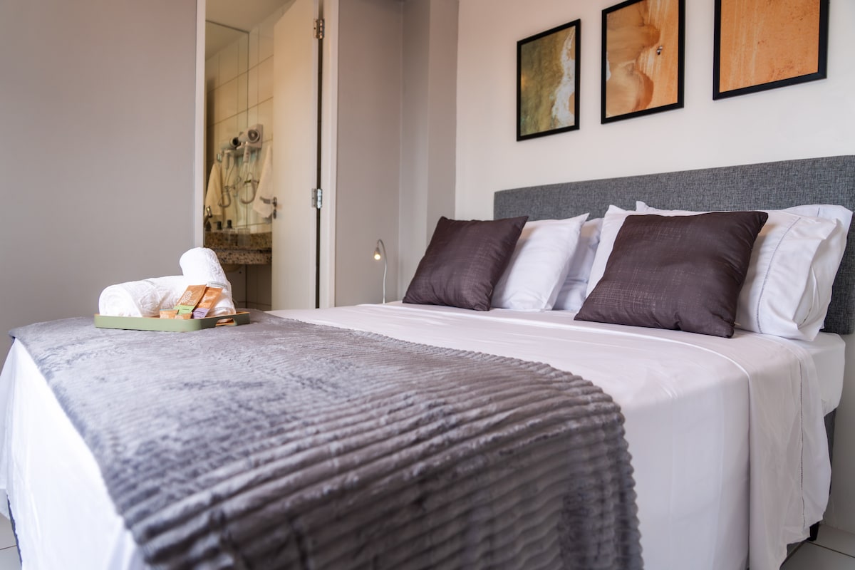 Pontos altos: • Praticidade para curtas ou longas estadias: cada detalhe foi pensado para seu conforto, com várias conveniências próximas: supermercado a 300 metros, padarias, academias, lanchonetes, salões de beleza, mercadinhos e farmácias próximas. • Localizado no 3º andar com redes de proteção, em condomínio fechado com portaria 24h e vaga de garagem interna gratuita. Acesso via escadas. • Toalhas de rosto e banho, roupas de cama e cobertores inclusos para uma estadia sem preocupações.