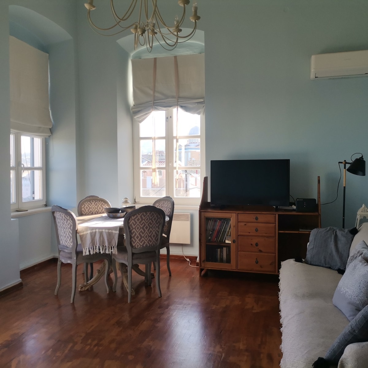 The 1870 listed neoclassical town house lies in the heart of Ermoupolis. The entire second floor, saved for our guests, is a spacious and sunny suite with a spectacular view over the city and the Aegean sea. It consists of 2 bedrooms, 1 bathroom, a living room with access to a balcony and a kitchen. On the third floor is a huge terrace. The space is perfect for families, couples or a group of friends and everything is at a very short walking distance.