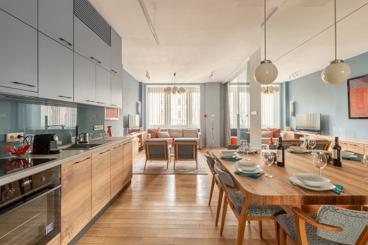 As another gem in our unique apartment collection, we present a brand new home away from home to the discerning Budapest visitor in an unbeatable location. It is stylish, luxurious, comfortable, and true to its environment and the architectural style of the building. It is one of the few genuine Bauhaus buildings in central Budapest, and while, of course, in a modernized way, we tried to stay true to many elements of this influential style when we created this unique apartment.
