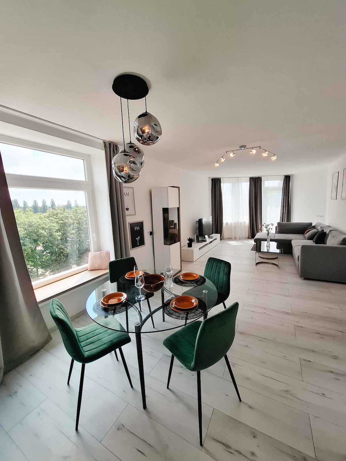 Another gem in our highly popular Architecture Series, again in the Art Deco style, is located in a palatial building in the absolute center. As always, not just aesthetics was in focus, but also the ultimate comfort for up to four people. Two separate bedrooms and two bathrooms with a living area in the locus of the apartment. Many high-end features (including a drier, a rarity in Budapest). Despite the busy location, the apartment is also quiet, ensuring a good night's sleep.