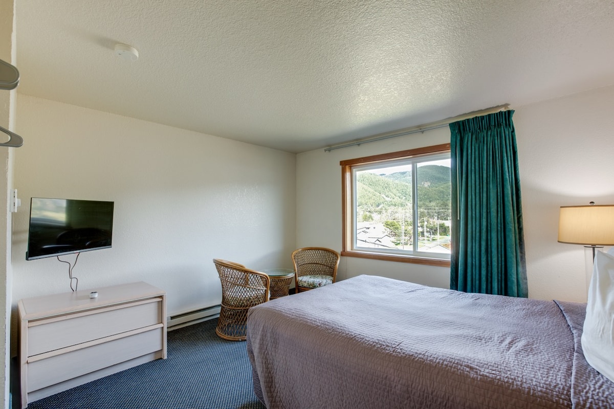 Unit # 2 is a rather small room (~150 sq/ft) suitable for one or two people who are looking for a comfortable place to sleep. It is 1 block from the beach and 3 blocks from town center. It has a queen size bed a small builtin desk and TV. There is a sink in the room, a mini refrigerator, microwave and coffee pot for perfect for keeping snacks and making morning coffee. The bathroom has a shower stall. It is located west of Highway 101 across the street from Dollar General.