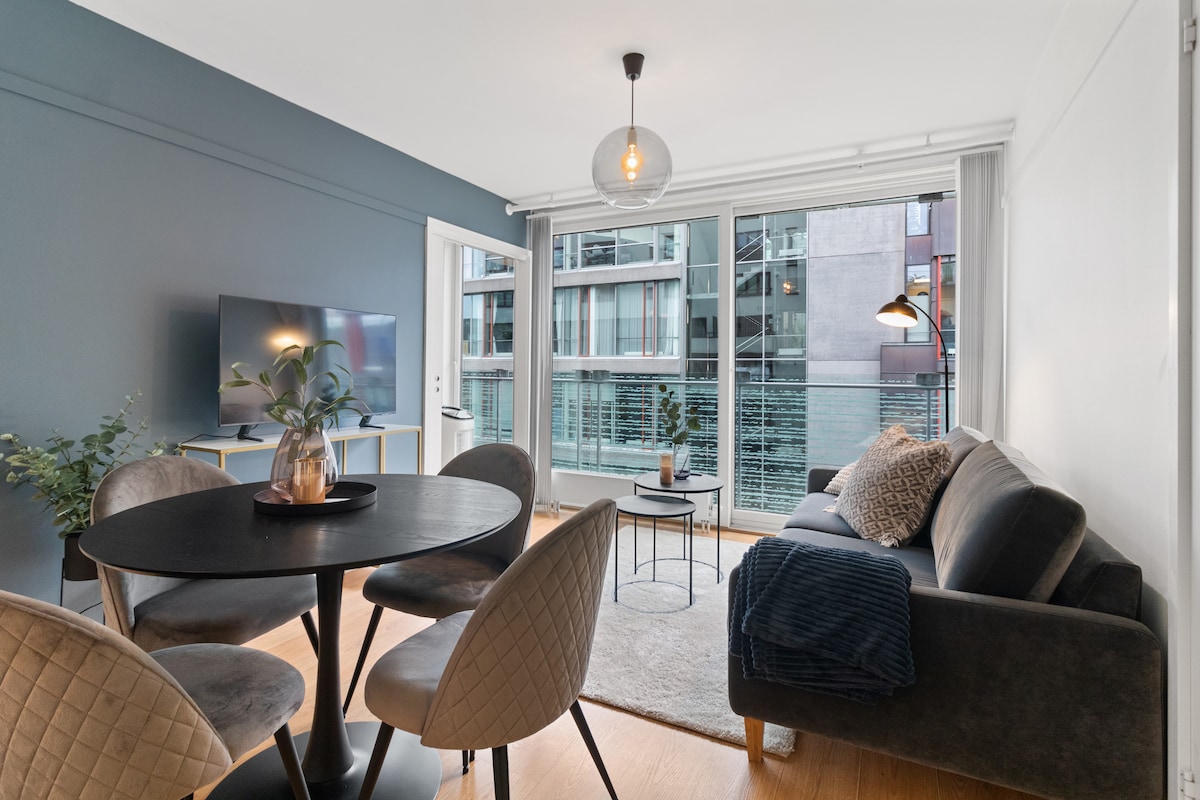 Stay in the absolute center of Oslo when you book this cosy, smart & bright 1BR apartment. Located at beautiful Tjuvholmen, only a walking distance from Oslo's shopping streets, restaurants and historical landmarks & museums with easy transportation to all of Oslo. The rooftop allows you to enjoy beautiful sea view sunsets in a relaxed environment in down town Oslo. Experience the best Oslo has to offer in terms of restaurants, shopping and cozy cafes as your neighbors@Tjuvholmen.