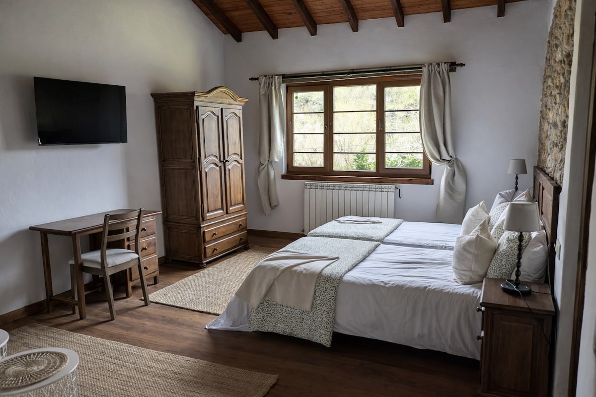 Alojamiento Rural en plena naturaleza con preciosas vistas a los Picos de Europa. Comedor para alojados. A solo 10 min de las mejores playas. Finca con animales autóctonos, asturcones, xaldas y casinas. Ideal senderismo. Habitación abuhardillada con cama matrimonial, tv, baño con ducha, secador, calefacción, vistas a Picos de Europa. Este tipo de habitación no permite alojar mascotas. Aunque en nuestro perfil hay otros alojamientos que sí, bajo petición